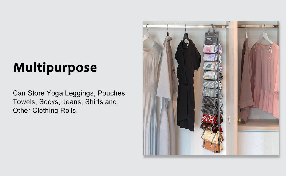 - Size: 51.18 x 8.27 x 0.31 inch; Each Slot Size: 5.51 x 3.94 inch; this hanging bag is suitable for yoga leggings, pants, shirt, jeans, underwear, scarf, socks with roll diameter less than 5.25 inch